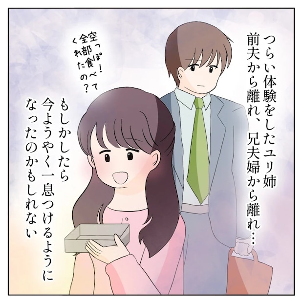 俺には想像もできないほど、つらい体験をしたユリ姉。前夫から離れ、兄夫婦から離れ・・・もしかしたら今ようやく一息つけるようになったのかもしれません。俺は、空っぽになったお弁当箱を手に嬉しそうに微笑むユリ姉の後ろ姿を見つめながら、そんなことを考えました。
