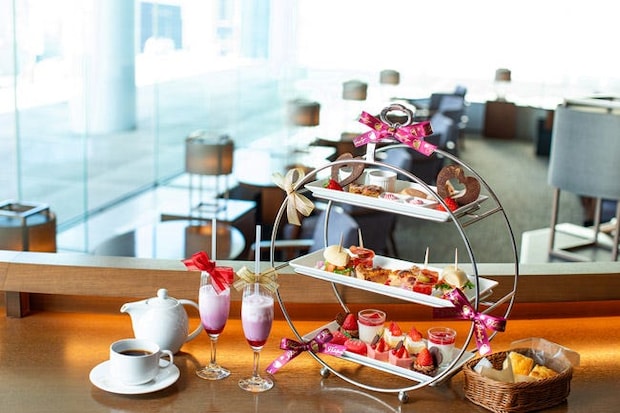 リボンがあしらわれた愛らしいティースタンドには、フレッシュないちごを贅沢に使用した「苺のショートケーキ」や、いちごをモチーフにした「苺のマカロン」、ハートのチョコレートが添えられた「苺とチョコレートのタルト」など、心ときめくいちごスイーツが勢揃い。
