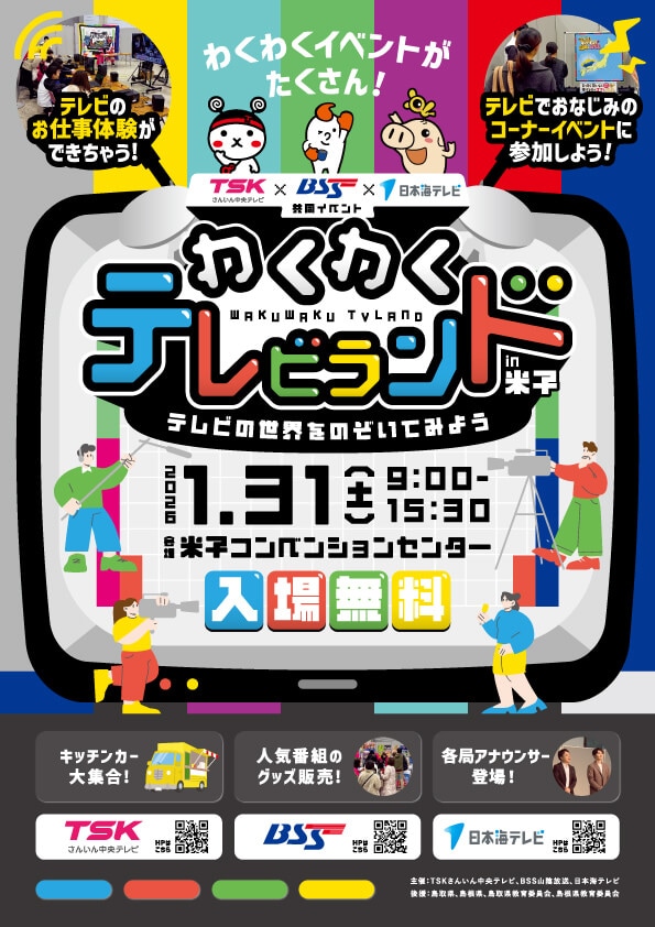 山陰のテレビ局「日本海テレビ」「TSK」「BSS」が一緒になって開催するイベント「わくわくテレビランド」が、2026年1月31日(土)に米子市の米子コンベンションセンターで行われます!