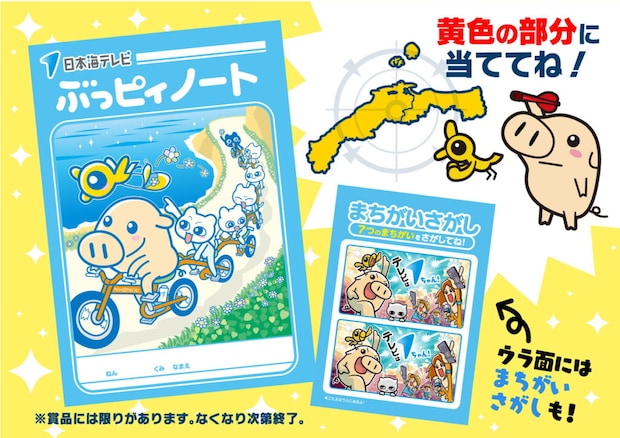 笑ってコラえて!の「ダーツの旅」でおなじみのダーツゲームに挑戦。鳥取・島根に当たれば、日本海テレビキャラクターのぶっピィノートがもらえます。
