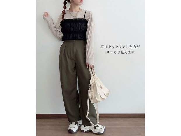 ビスチェも他のアイテム同様トレンドはショート丈。着用するだけで、手持ちのアイテムもトレンド感あふれるスタイルに変身! ショート丈のアイテムは全体のバランスをとるのが難しいと感じる人は、思い切ってインナーをタックインしてみて。タックインすることで、コーディネートのバランスが整うだけでなく、メリハリができ、さらに目線が高くなるので足も長く見えてスタイルアップ効果も抜群です。