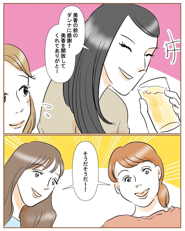 「美香の前のダンナに感謝!美香を開放してくれてありがとー」と麗子が言うと、他の二人も「そうだそうだ~!」と言って明るく励ましてくれました。その後、世間話や仕事の話を交えつつ、私たちは女子会を楽しみました。