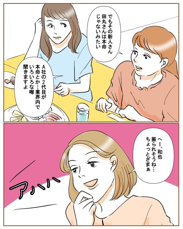 すると、「でもその新人さん、田丸さんは本命じゃないみたい。A社の2代目が本命とか・・業界内でいろいろな噂聞きますよ」と何やら面白そうな話を教えてくれた同期。「へー、和也振られそうね・・ちょっとざまぁ」と言うと、みんな大笑い。和也は真実の愛とか言っていたけど、ほなみちゃんはどうやらそうは思ってないみたいですね。ま、私には関係のないことですが。
