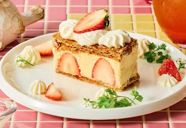 メインスイーツには、当時ロンドンの町中で流行っていた「カスタードスライス」をいちごバージョンに仕立てた「ストロベリーカスタードスライス」がラインナップ。ほろ苦いパイで、クレーム・ムースリーヌといちごをホールでサンドした至極の1品に。クレーム・ムースリーヌは、濃厚なカスタードクリームにバタークリームを合わせた、コクがありながらも軽い口溶けが特徴。イタリアンメレンゲを使用することで、軽やかな口当たりを実現している。うっとりするほど美しい断面にも注目してみて。