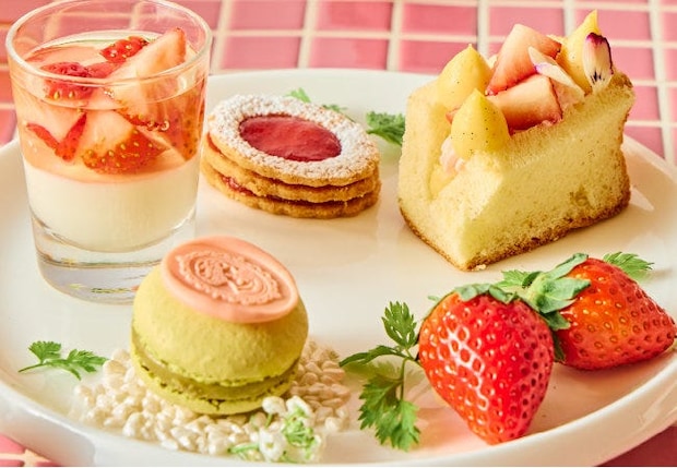いちごをたっぷり詰め込んだ「苺練乳ミルクプリン」や、まるでブローチのようなクッキー、ふわふわの「いちごシフォンサンド」、ビンテージ感あふれるカメオのスタンプチョコレートを添えた「クラシックピスタチオマカロン」、そして素材そのままの味わいを堪能するみずみずしい「フレッシュ国産苺」を用意。華やかなスイーツはどこか1980年代のロンドンを思わせる内容に。