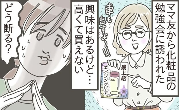 化粧品の勉強会に誘われたものの、高額で購入できないことや、しつこい勧誘への不安から参加を取りやめたいという投稿者さん。ママ友が送迎や予定調整をしてくれているため、どのように断ればよいか悩んでしまいます。
