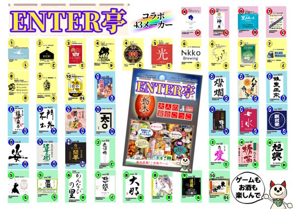 「ENTER亭」は、栃木県内の26酒蔵、12ブルワリー、4ワイナリー、1ディストラリーの全43軒と連携し、実際の酒ラベルやロゴを60枚のカードデザインに採用した、これまでにないご当地カードゲーム。ヤングアダルト3〜7人向けで、1ラウンド15分、1ゲーム1〜2時間となっている。
