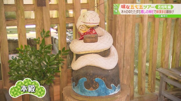 本殿には弁財天の文字が書かれた札が掲げられ、弁財天の化身とも言われる白蛇の像が置かれています。