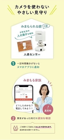 基本動作はとてもシンプル。一定の時間、人感センサーが動きを検知しない場合に、スマホアプリ「まもりこ」へ通知があり、通知が届いた場合のみ安否確認を行う。毎日アプリを開く煩わしさがないので、無理なく誰でも離れて暮らす家族を見守ることができる。