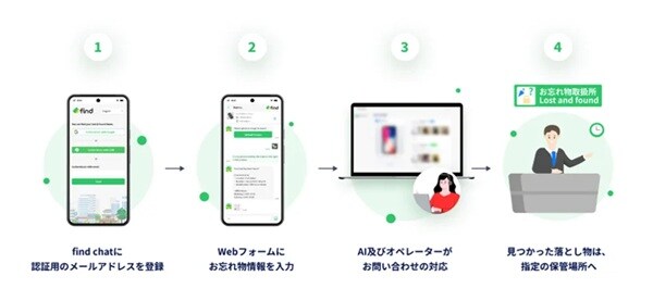 利用の際は、「find chat」に認証用のメールアドレスを登録し、Webフォームに忘れ物情報を入力。AI及びオペレーターが問い合わせの対応を実施、そして、見つかった落し物は、指定の保管場所へ。
