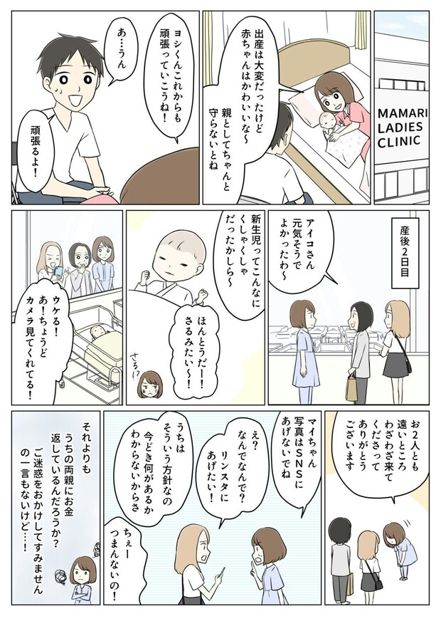 第1子を出産した主人公・アイコ。夫のヨシは以前から妹のマイに家計からお金を貸してしまうことがあり問題に感じていたものの、アイコの実父がマイを諭してくれたこともあり、お金の無心はおさまりつつありました。