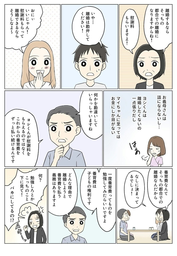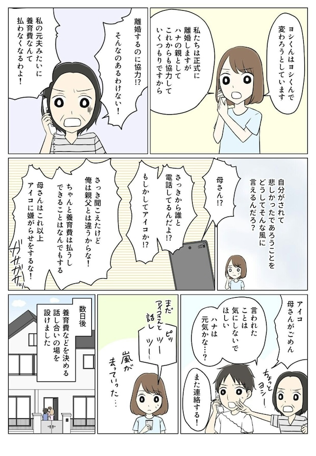 離婚が決まり、ヨシはアイコと子どものためにきちんと養育費を支払うことを約束します。ヨシは自分の金銭感覚がアイコや家族を傷つけていたことに気づき、反省している様子です。しかし義母にはまだアイコの思いが伝わっていない様子。