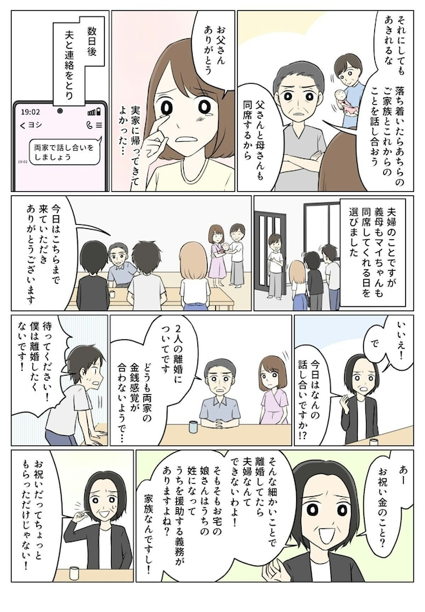 その事実について義母と実両親をまじえて話し合いますが、義母は「家族なんだからお祝い金も分けあって当たり前」という主張を崩しません。