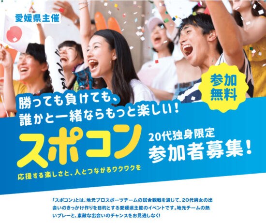 愛媛県主催「スポコン」は20代独身限定の特別イベント。プロスポーツ観戦を楽しみながら出会いのチャンスも!試合前のレクリエーションや選手間近での練習見学など特典も充実。無料参加で盛り上がれる一日です。
