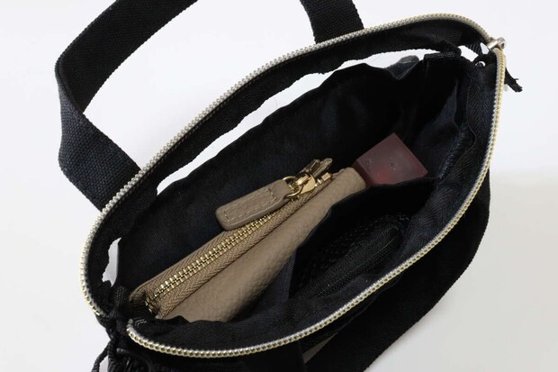 スマホ、三つ折り財布、リップ、有線イヤホン、ミニポーチを入れてみたところ、無理なく収まりました。パンパンにならず、きちんと定位置が決まる感じが心地いいです。