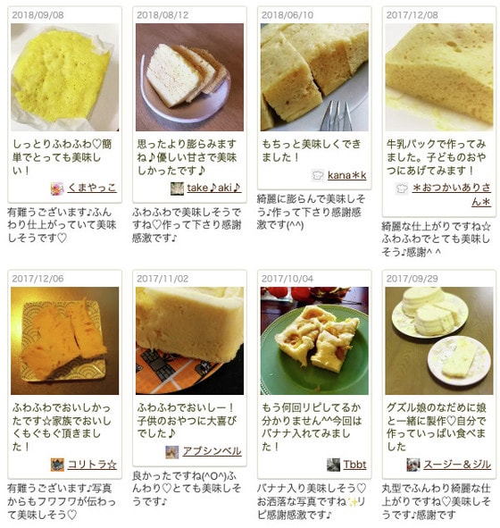 つくれぽ(作りましたフォトレポートのこと)にも「ふんわりもっちりでおいしかった!」「すぐできて嬉しい!」など、レシピの手軽さとふんわりした食感を絶賛する声がたくさん届いています。