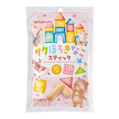国産大豆のきなこを使用し、小麦不使用。スティックタイプで、小さな子どもが手づかみしやすい形状になっている。