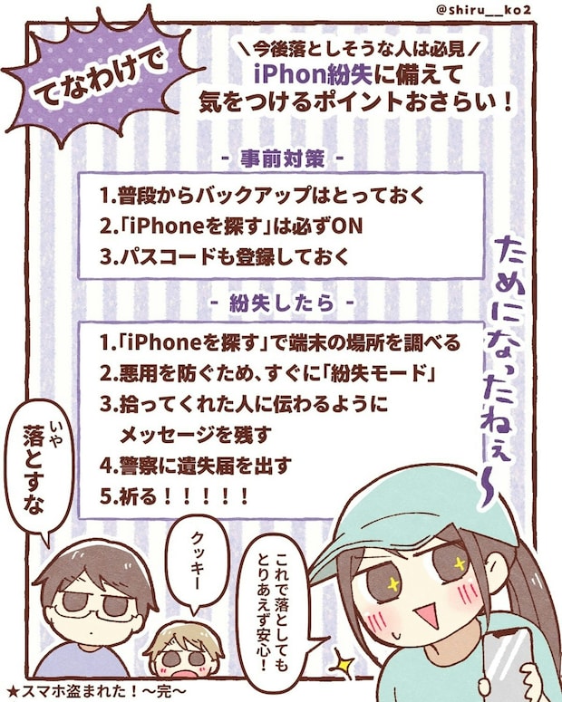 ①バックアップをこまめに取る、②「iPhoneを探す」をONにする、③パスコードを登録する。この3つをしておくことで、「もしもの時も、落ち着いて対応できる」とのこと。