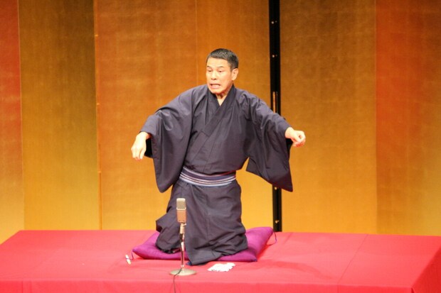 (古典落語「動物園」を熱演する八尾家朝吉さん)