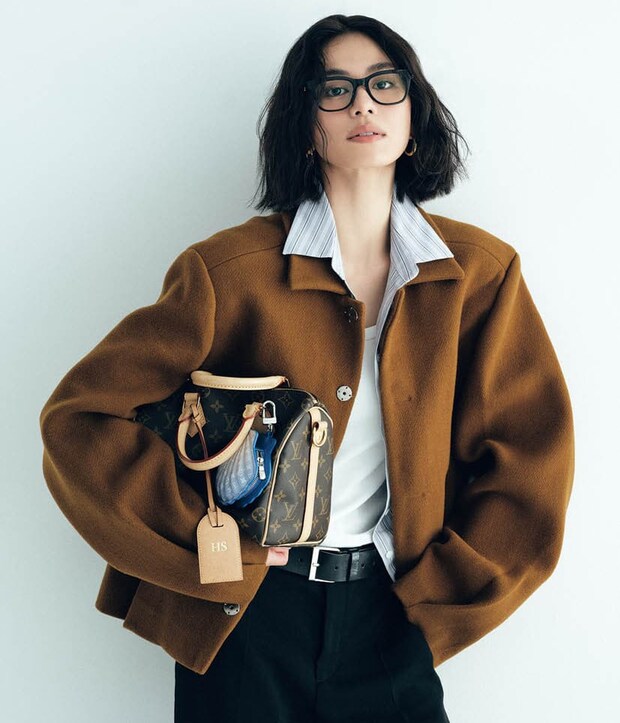 アーダーエラーのジャケット、ブラックアップのシャツ、ユニクロのタンクトップ、ブルネロクチネリのパンツ、ルイ・ヴィトンのバッグ、ティファニー&コーのピアス、メガネ/全て本人私物