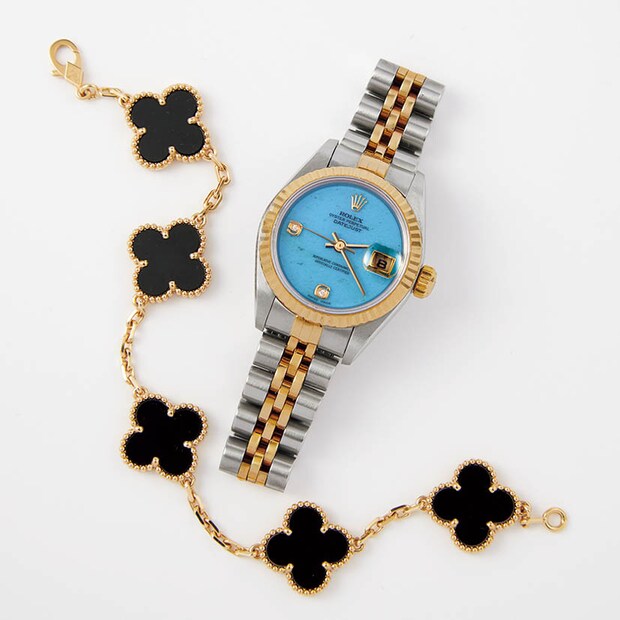 「時計はヴィンテージのロレックス。ずっと欲しかったモデルを偶然銀座で見つけて、これは運命! と即決。アルハンブラのブレスレットは深夜にオンラインで発見して♡」。ロレックスのヴィンテージウオッチ、ヴァンクリーフ&アーペルのブレスレット/共に本人私物