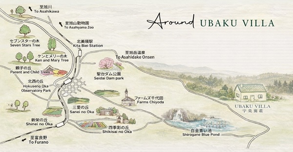 旭川と富良野の中間地点に位置する美瑛は、国内外から多くの観光客が訪れる一方で日帰りにとどまることが多い。Ubaku Villa周辺には公共交通機関が通っておらずレンタカーなどが必要となるが、その“ひと手間”をかけるからこそ、到着してからの時間をゆっくりと味わえる。慌ただしく観光地を巡る旅というより、土地に腰を下ろすように滞在できるのも魅力のひとつだ。