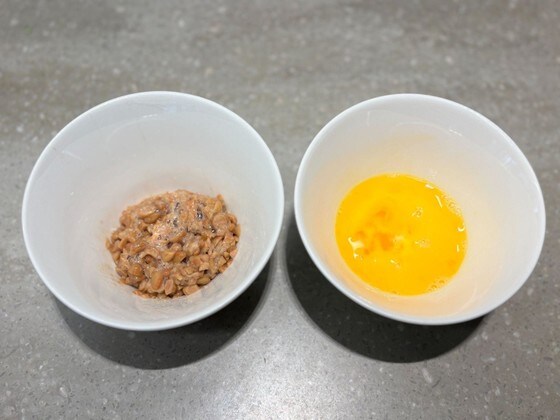 1. 納豆は包丁で叩いてひきわりにしてタレを絡め、たまごはよく溶いておきます。