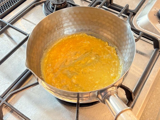 3. 2の調味料を鍋に入れて火にかけます。沸々としてきたら弱火にし、たまごを流し入れて常によくかき混ぜます。