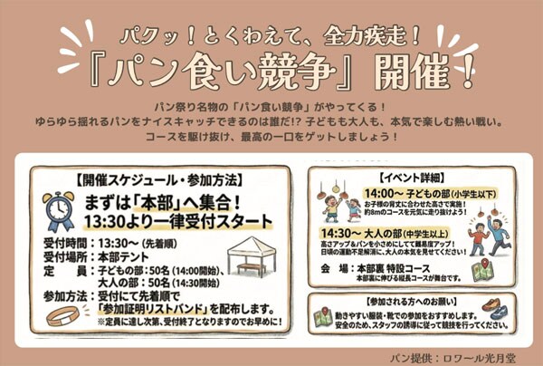 また今回、新企画の「パン食い競争」が開催される。14:00〜の子どもの部(小学生以下)は、子どもの背丈に合わせた高さでパンが用意され、約8mのコースを走る。14:30〜の大人の部(中学生以上)は、高さが上がり、パンが小さくなって難易度がアップする。
