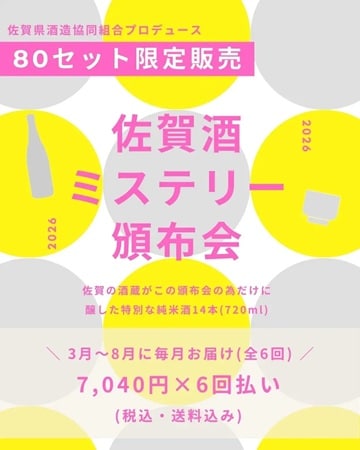 「佐賀酒ミステリー頒布会2026」では、佐賀県内14酒蔵が同頒布会のためだけに醸した純米吟醸または純米大吟醸(720ml)が、3月~8月に計6回届けられる。本数は、3月3本、4月2本、5月2本、6月に2本、7月3本、8月2本の計14本。毎月25日頃に自動発送される。