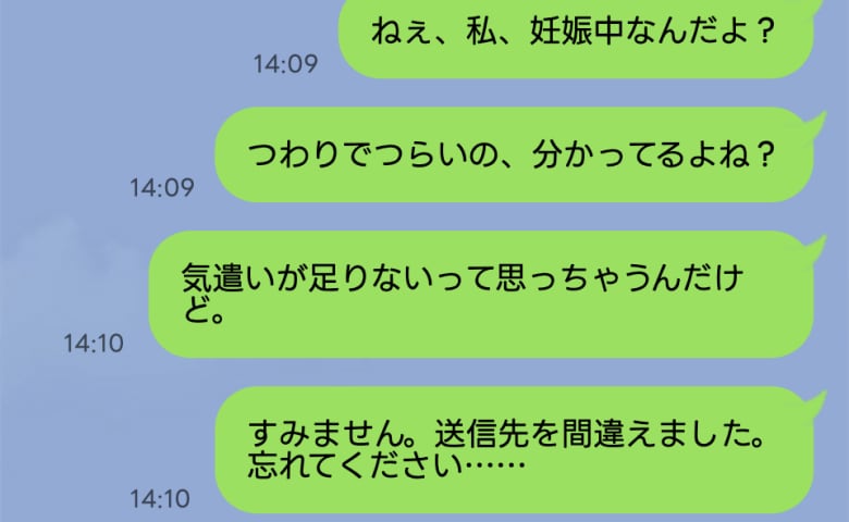 妊娠中のある日、寝不足でぼんやりしながらスマホを触っているとき、とんでもない誤爆LINEをしてしまいました。夫への愚痴をこぼしたメッセージを作成していたのですが、送信ボタンを押した瞬間、宛先が夫ではなく義母になっていることに気づいたのです。
