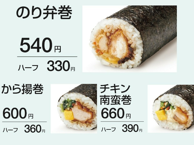 どれもお店で1本ずつ、ていねいに手巻きして作っているのが美味しさの理由です! 「お弁当をそのままかぶりつけるのが楽しい!」と店長さんたちからも大人気です。