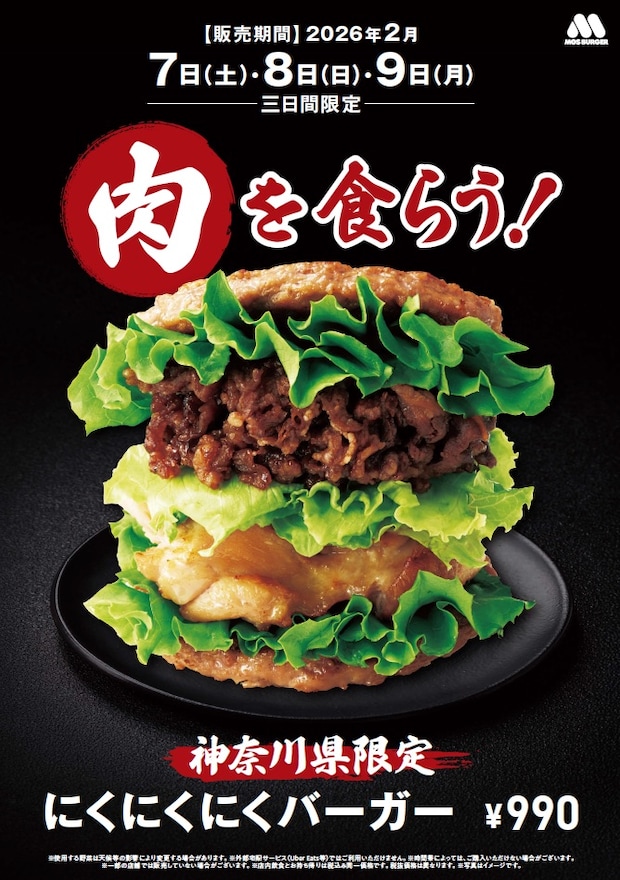 ハンバーガーチェーン「モスバーガー」は、2026年2月7日(土)~2月9日(月)までの3日間限定で、人気商品「にくにくにくバーガー」を、神奈川県内のモスバーガー89店舗(一部店舗を除く全店)で販売する。※文中価格は全て税込表記