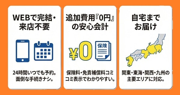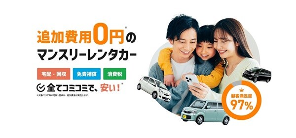 「借りたい時に、借りたい場所で」をコンセプトに、WEBで完結する予約システムと、追加費用0円(保険・免責補償料込み)のわかりやすい料金体系で、自宅まで届く手軽さを提供している。