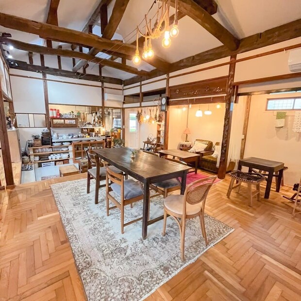 築70年の古民家をリノベーションしたカフェ型レンタルスペースです。梁や柱はそのまま残され趣があり、アンティーク調の家具や照明がとても素敵な空間。