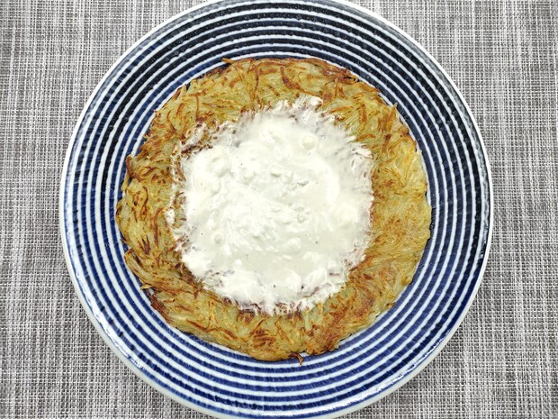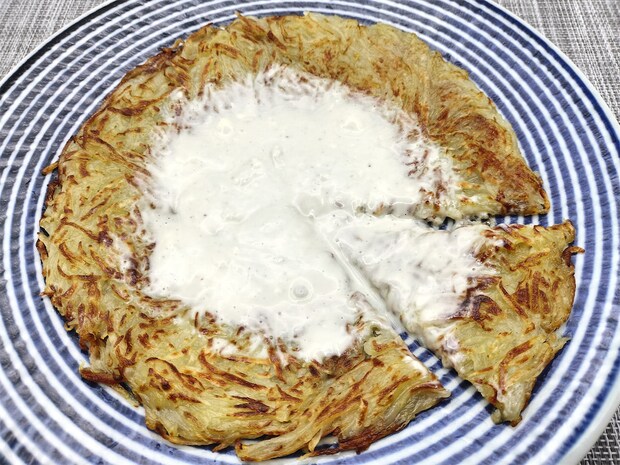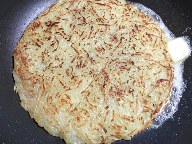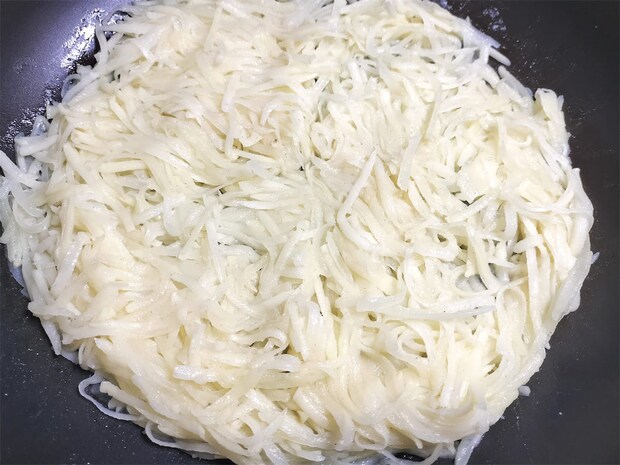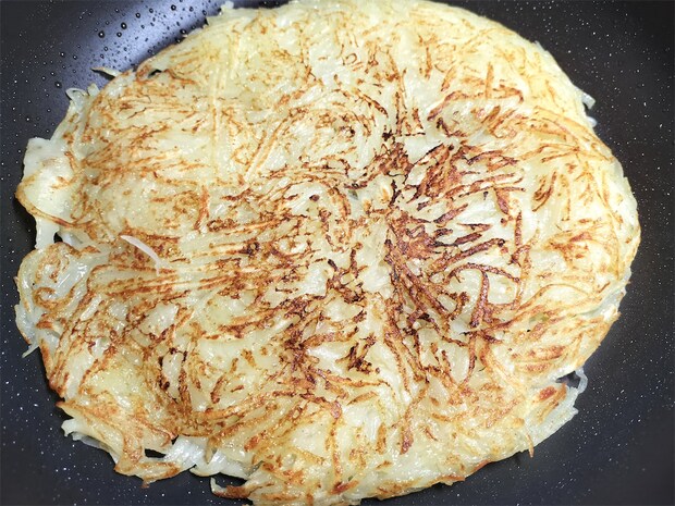 このレシピでは、じゃがいもを切っても水にさらさず、そのまま使います。つなぎを加えず、じゃがいも自身の粘りを生かすことで、ほくほく感としっかりした味わいを引き出し、表面はカリッと香ばしく仕上がります。粉っぽさもなく、食感のコントラストが際立つのも魅力。大きなフライパンで作ると見栄えは抜群ですが、返すときは崩れやすいので慎重に。