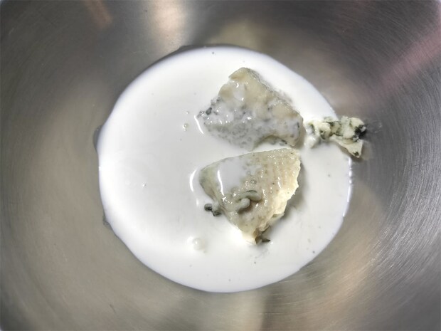 4. 焼いている間に別のボウルにブルーチーズを入れてつぶし、生クリームを混ぜておきます。