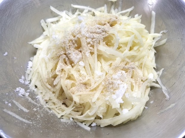 1. ボウルにじゃがいもを入れ、塩とこしょうを振って混ぜます。