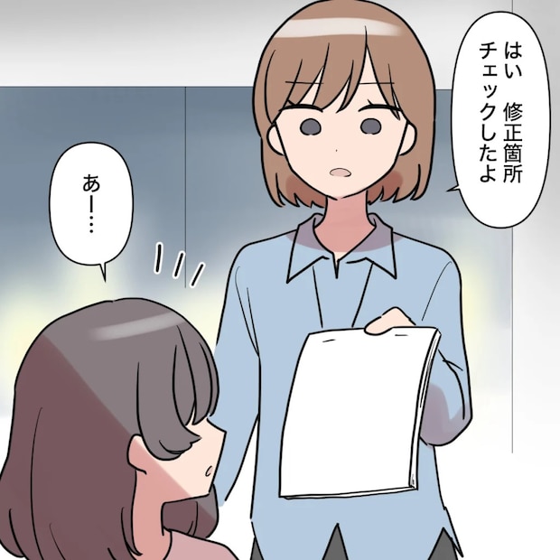 すると田中さんは両手を合わせ、「佐藤さんごめんなさい、修正部分を直した状態で頂いてもいいですか?」と頼んできました。思いもよらないお願いに、私は思わず「え?」と声を漏らします。「私、他の仕事も任されていて・・・手が回らなくって」どうして私が田中さんの仕事までやらなきゃいけないの?