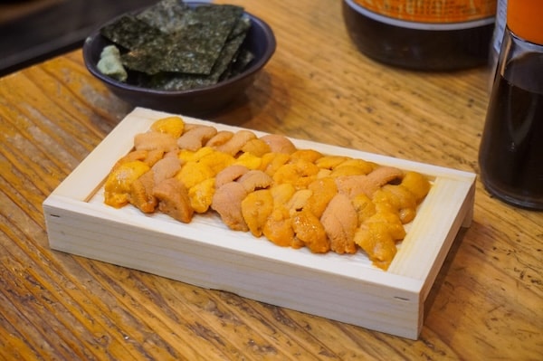ウニが箱で、カニが山盛りで