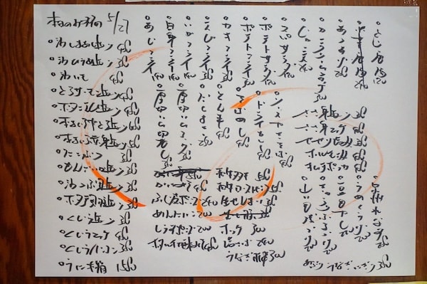 この店のもうひとつの名物。それは、店主の手書きメニュー。ただ、それがまあ、読めない。何が書いてあるか、解読大会がはじまるのも八番あるある。