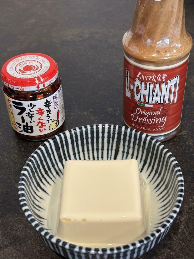 絹豆腐または木綿豆腐の上にドレッシングをたっぷりかけ、さらにカリカリ食感が楽しい「食べるラー油」をトッピングするだけ! ドレッシングの上品な味わいと豆腐の相性に、ラー油のカリカリとした食感と香ばしさが加わり、まさにお酒が進む最高のスピードメニューが完成します。 これはクチコミ必須の裏ワザです!