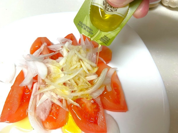 トマトと新玉ねぎのサラダにオリーブオイルと塩をかけて。