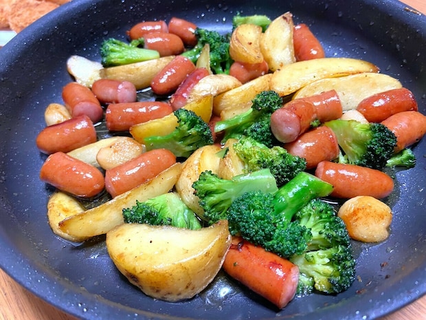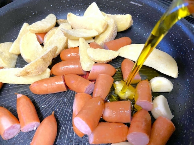 ウインナーや野菜をアヒージョ風にオイルを多めに入れてサッと炒めたおかずが我が家で大人気。