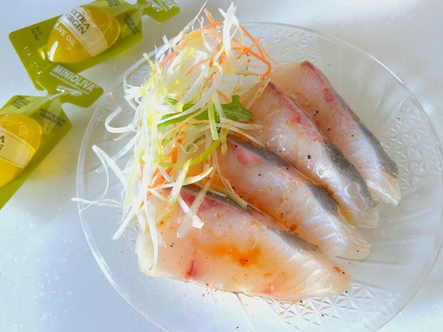 フレッシュなオリーブの香りで、サーモン、鯛、ぶり、海老、たこなどいろいろな魚介類によく合いますよ。