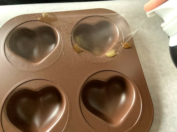 型にシュッとオリーブオイルスプレーをしてから生地を流し込んで焼きます。