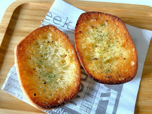 コストコで買ったマスカルポーネロールにオイルをスプレーしてガーリックソルトをかけてトースターで焼けば、簡単ガーリックトーストの完成!