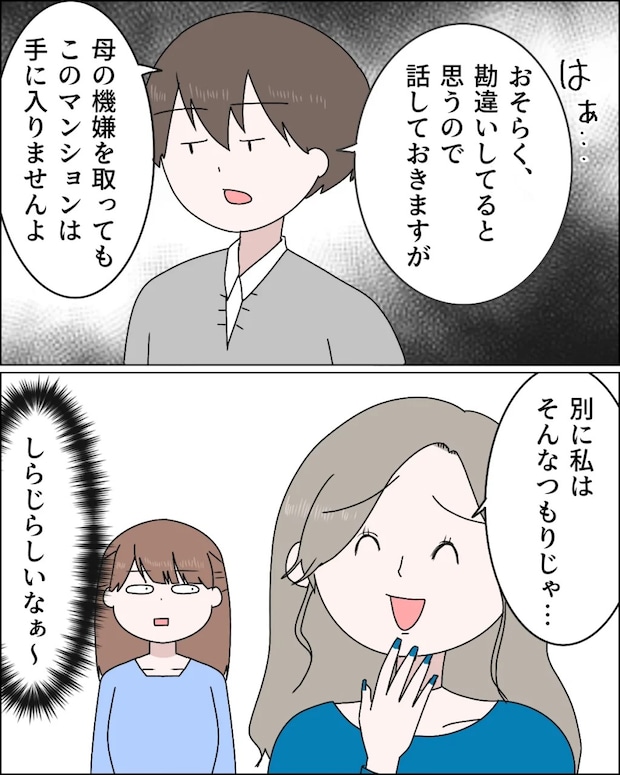 「はぁ・・おそらく勘違いしてると思うので話しておきますが、母の機嫌を取っても、このマンションは手に入りませんよ」康太がため息をつきながらそう言うと、「別に私はそんなつもりじゃ・・」とサラリ。私は「しらじらしいなぁ~」と心の中で呟きました。