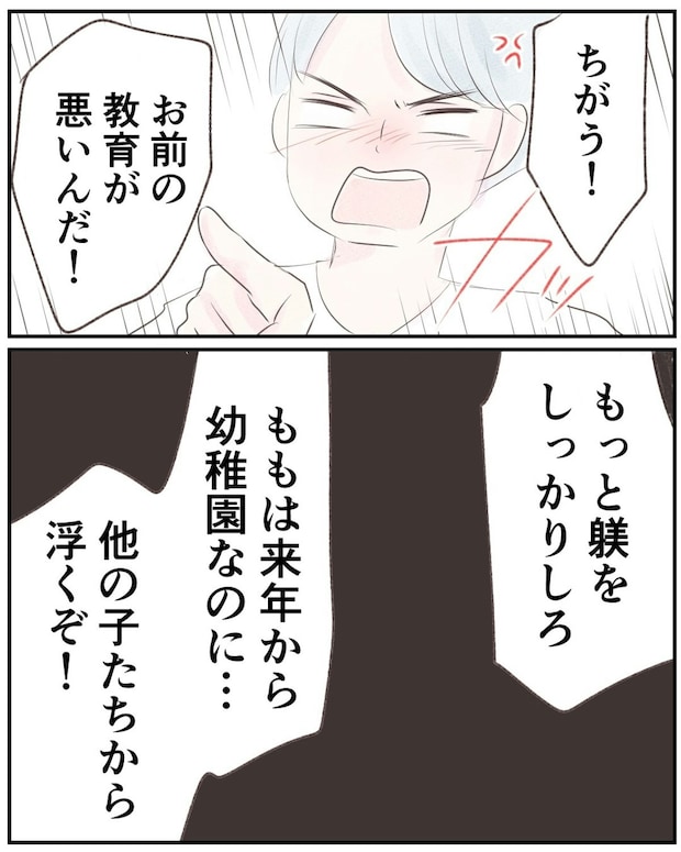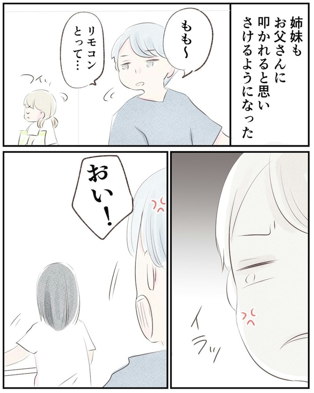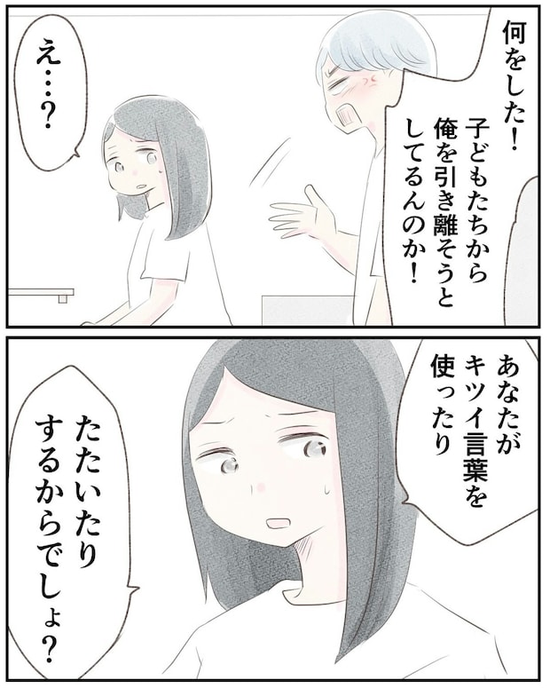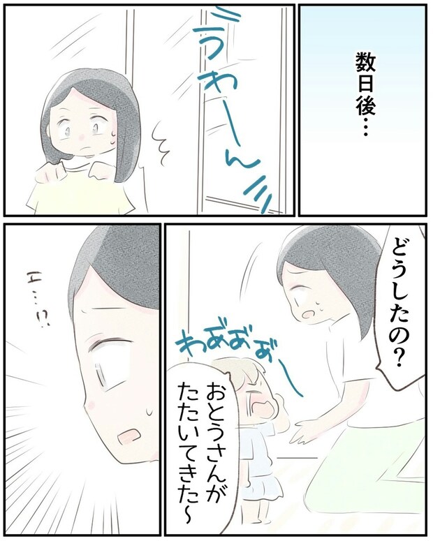 ある日、娘が泣きながら「お父さんにたたかれた」と言ってきたので、ゆうさんは驚きます。夫に言うと、遊んでいて手が当たっただけだと平然とした態度です。次第に娘に避けられるようになった夫は、ゆうさんに「しつけができていない」と怒鳴りはじめます。