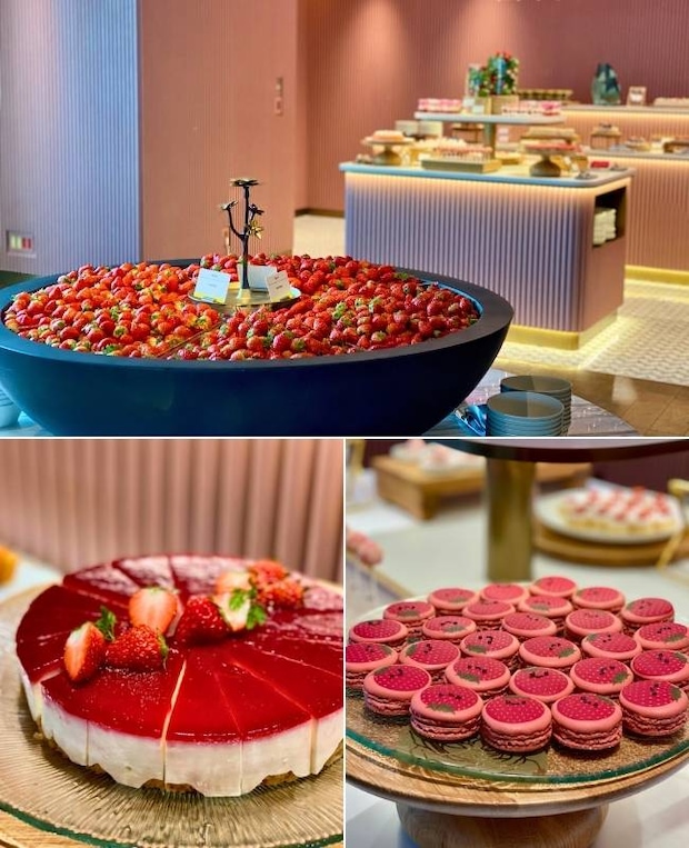 写真上:デザートルーム前の“いちごボウル”/写真左下:レッドレアチーズケーキ/写真右下:ストロベリーマカロン